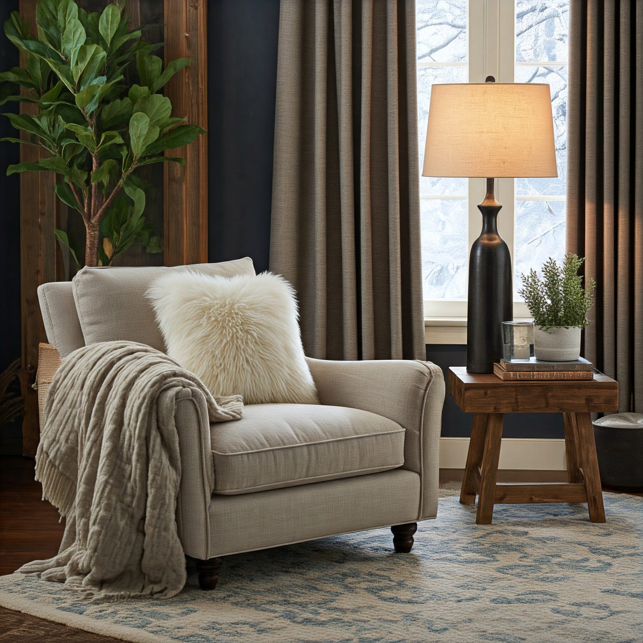 Picture this: a chair so plush it feels like you’re sitting on a cloud. A wide seat, overstuffed cushions, and soft upholstery make this type of chair a winter essential. Look for options with armrests roomy enough to hold a cozy blanket or two. Bonus points if it comes in a warm, neutral tone that matches your reading nook’s aesthetic.